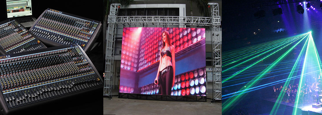 Ponemos a su disposición la más moderna tecnología para la creación de su evento: Mesas de sonido, escenarios, iluminación LED, cabezas móviles e iluminación fija, pantallas LED.